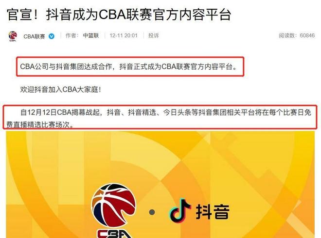 12月11日晚8點,CBA官方發布公告,宣布與抖音集團達成戰略合作。
