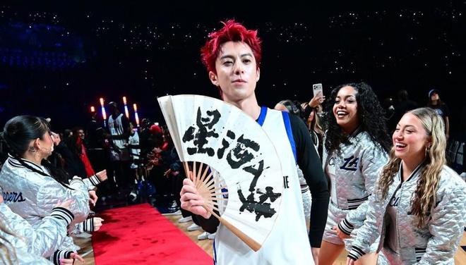 名人賽入場儀式上,王鶴棣獲得全熱烈的歡呼聲,他打開折扇,宣傳自己的新電影《星河入夢》。