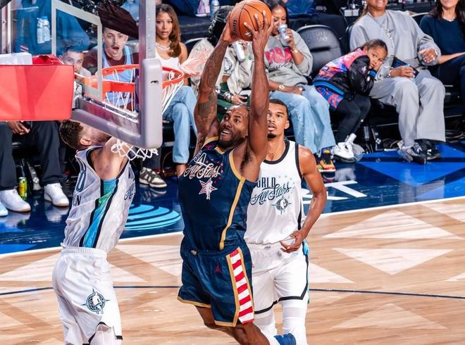 小試牛刀!面對世界隊,對位的是本屆全明星最努力的另外一位球星:文班亞馬,結果倫納德打滿12分鐘,13中11,爆砍31分3籃板2搶斷!場邊的庫里和老詹都成小迷弟,當倫納德無解三分再中后,起立揮手非常興奮。文班亞馬自己都說:我從一開始就防守倫納德了,確實拼盡全力去防了!而決賽打美國新星隊,倫納德又打滿了12分鐘,4中0,拿到1分1籃板1助攻。你們多久沒在全明星舞臺上,看到過三人包夾圍堵一名全明星遞補了?倫納德做到了,為了限制倫納德得分,對手三人包夾車輪戰!于是倫納德數據,最終定格在34分鐘轟下37分。