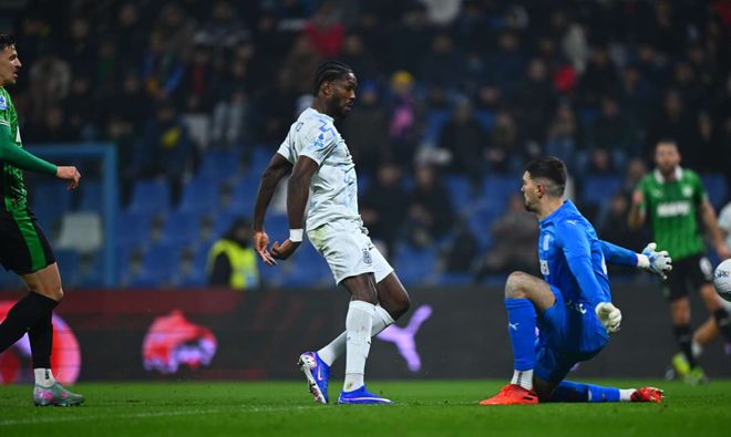 第62分鐘,薩索洛后防混亂,小圖拉姆射門被門將一撲打在門柱上。