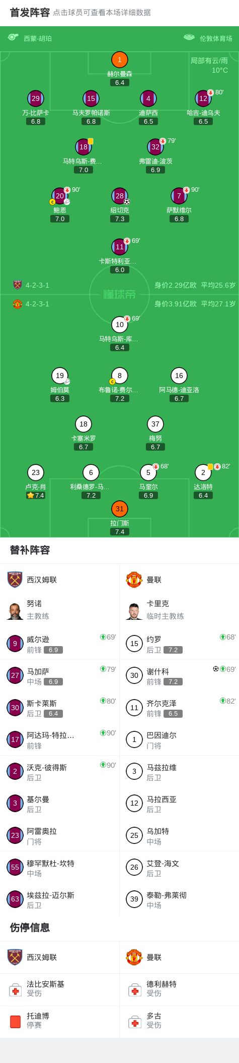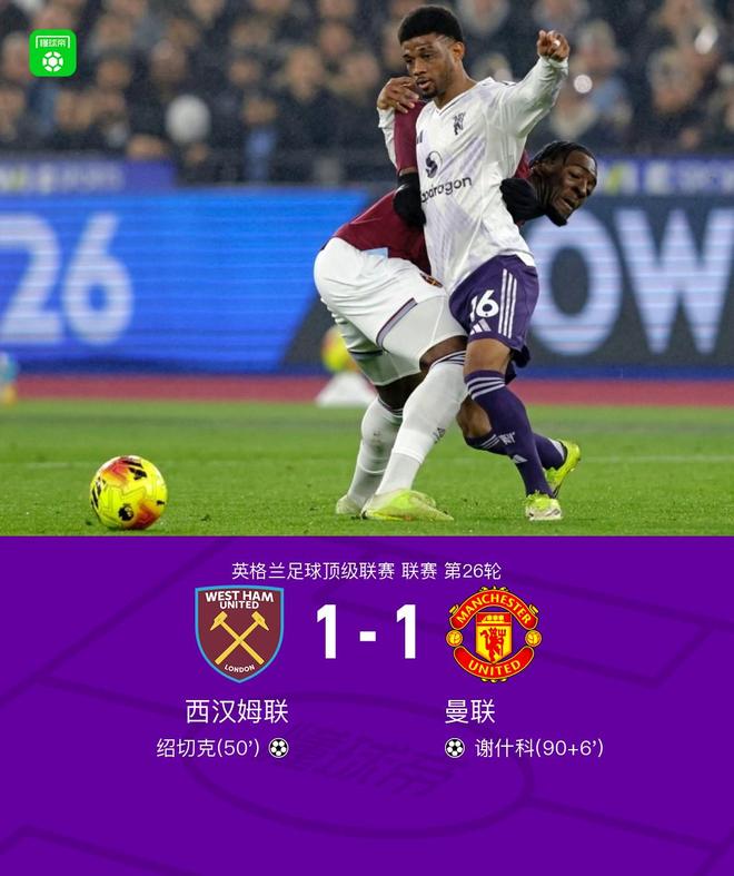 北京時間2月11日英格蘭足球頂級聯賽 聯賽 第26輪,西漢姆聯主場對陣曼聯。西漢姆聯紹切克破門。曼聯謝什科破門。最終比分西漢姆聯 1-1 曼聯。