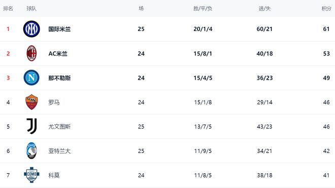 在積分榜上,此輪獲勝的國際米蘭以61分高居榜首。AC米蘭拿到53分,排名第2。AC米蘭足足比國際米蘭少了8分。不過,AC米蘭少賽一場(chǎng)。顯然,國際米蘭已經(jīng)距離冠軍越來越近了。那不勒斯只拿到49分,排名第3。落敗的尤文圖斯依然是46分,排名第4。羅馬以46分排名第5。第6的是亞特蘭大,拿到42分。科莫?jiǎng)t被亞特蘭大擠到第7的位置,總積分是41分。拉齊奧只拿到33分,排名第8。