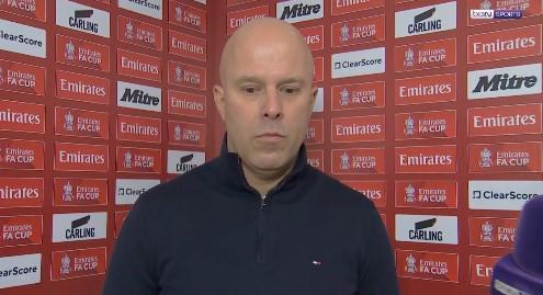 英格蘭足總杯第4輪,利物浦主場(chǎng)3-0戰(zhàn)勝布萊頓,利物浦主帥斯洛特賽后接受了拜因體育的采訪。