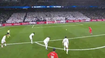 第31分鐘,皇馬左路制造機會,卡雷拉斯插上適配巴爾韋德,皇馬的領導者迅速推射破門。雖然是推射,可是皮球速度實在太快了,力度也猛對此皇社的門將無計可施。3-1。