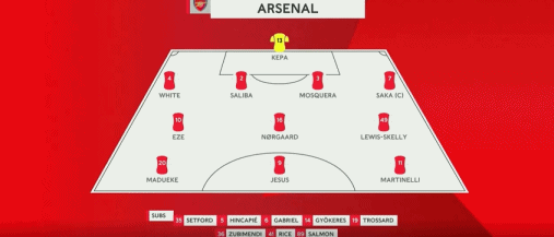 薩卡頂替受傷的卡拉菲奧里首發,轉播陣型顯示位置為左后衛