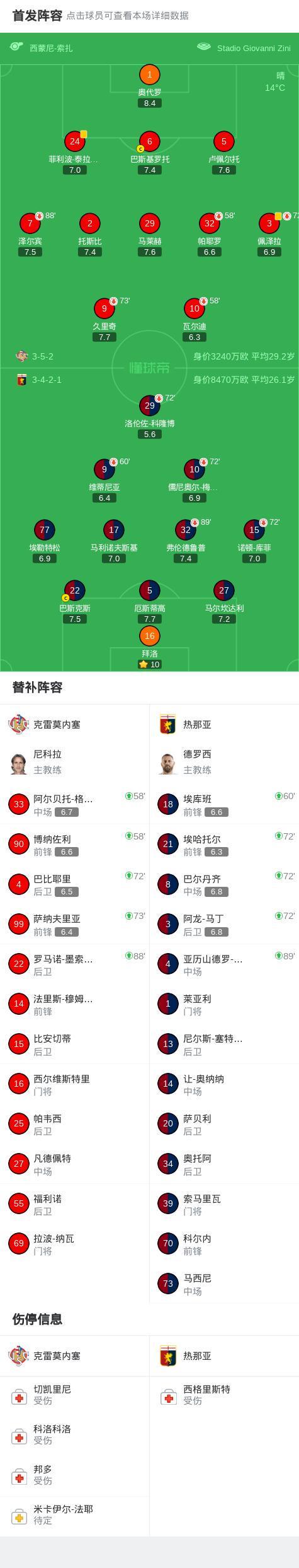 北京時間2月15日意大利足球甲級聯賽第25輪,克雷莫內塞主場迎來熱那亞的挑戰。全場比賽結束,兩隊均未攻破對方球門,最終克雷莫內塞0-0戰平熱那亞。
