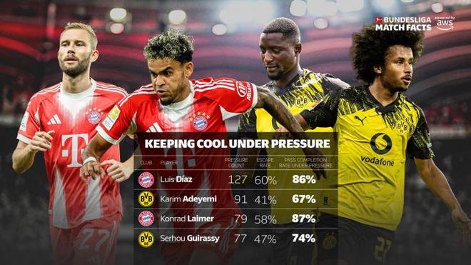 第一輪國家德比前,德甲官方數據AWS就曾強調指出:路易斯·迪亞斯在壓力下極為冷靜。在本賽季的127次壓迫情境中,迪亞斯成功擺脫了其中的60%。更令人印象深刻的是,在壓迫下,這位哥倫比亞人的傳球成功率高達86%(數據截止2025年10月17日)。