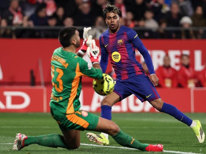第43分鐘,拉菲尼亞的低射擊中了右側立柱彈出。隨后,奧爾莫制造點球機會。亞馬爾主罰,結果他的射門也是擊中立柱,太無奈了。巴薩連續兩次中柱,運氣有些差。半場結束,巴薩0-0赫羅納。